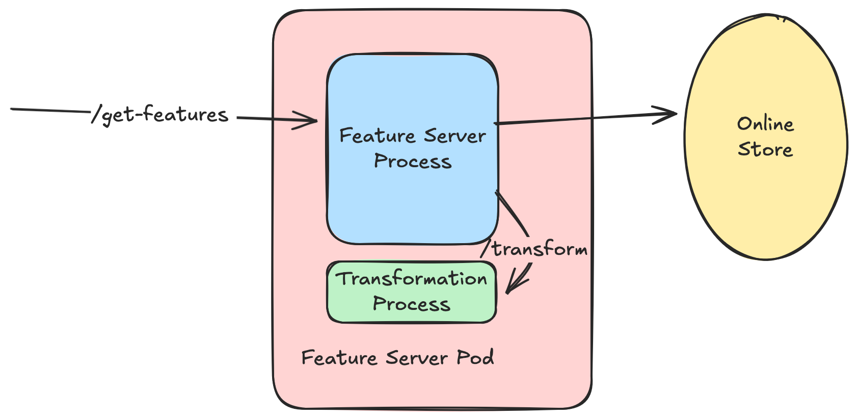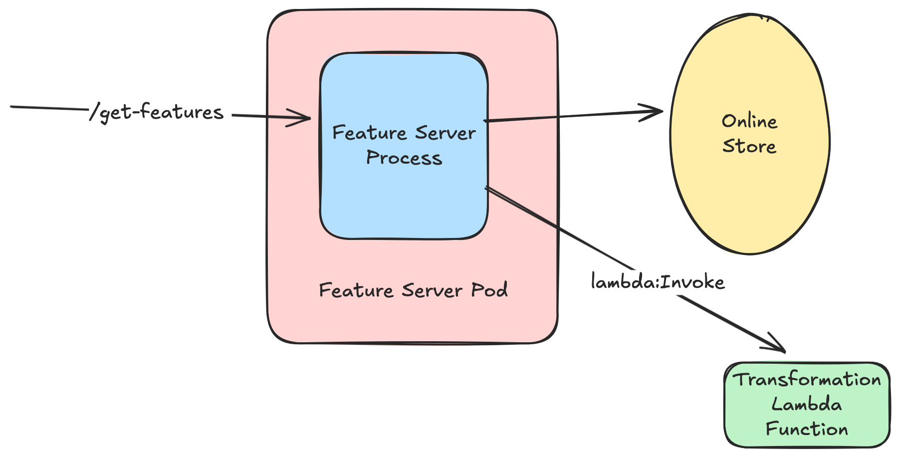 At Tecton, there was a V0 implementation that found its way into production - we allows users to express transformations as Python UDFs. These UDFs would run in a Python sub-process, colocated next to every single Feature Server process. The Feature Server would retrieve records from the online store, pass them into the python interpreter for processing, and retrieve the response and return it callers.