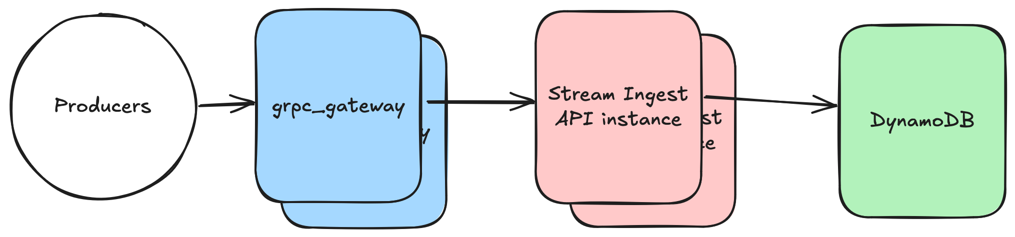 The Stream Ingest API was a grpc service, implemented in Kotlin, fronted by grpc-gateway to expose an HTTP/JSON API. Records could be batched in a single request, capped at 10records per request. Writes were made synchronously. In case of request failures, the whole request needed to be retried.